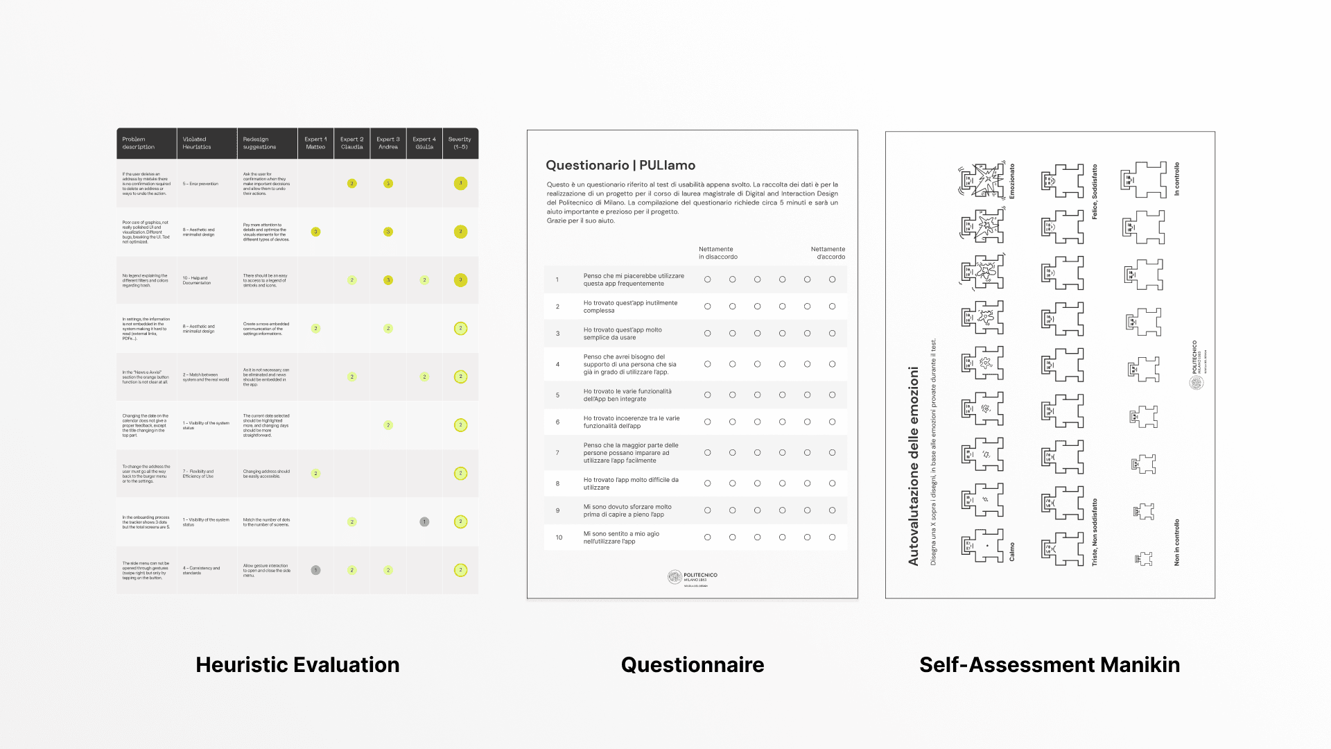 The team developed a schedule of what were intended outcomes and the necessary assets and users needed to accomplish the usability test. Once the list of tasks was defined and the final evaluation questionnaires were settled (SUS,SAM) we proceeded to define which were the participants that could have brought significant insights to the study.