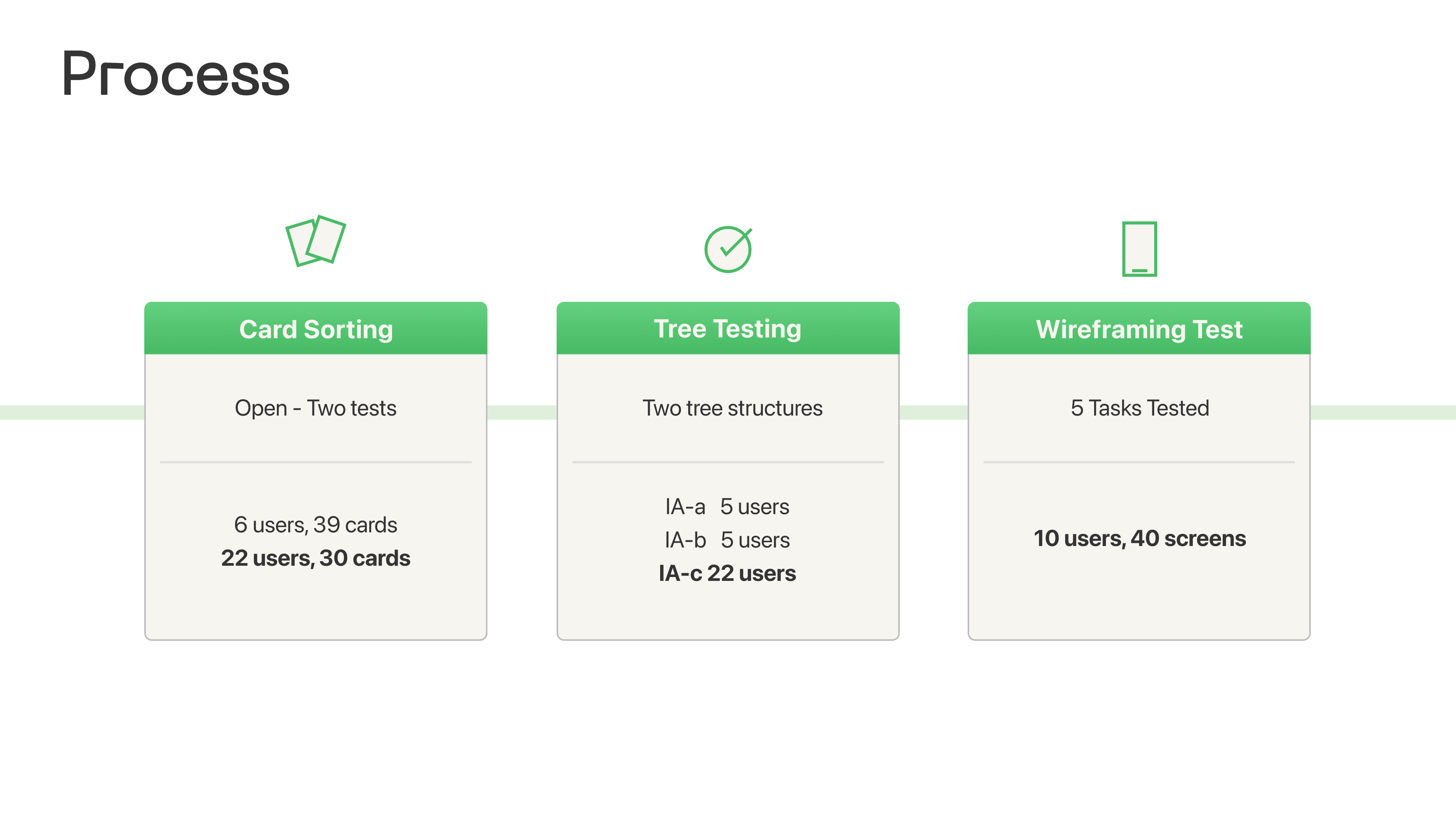 First step was to perform some pre-tests to further refine and improve the test. The official tests were then performed, and resulting data and insights were finally aggregated and analysed to identify problem areas and task-related issues.