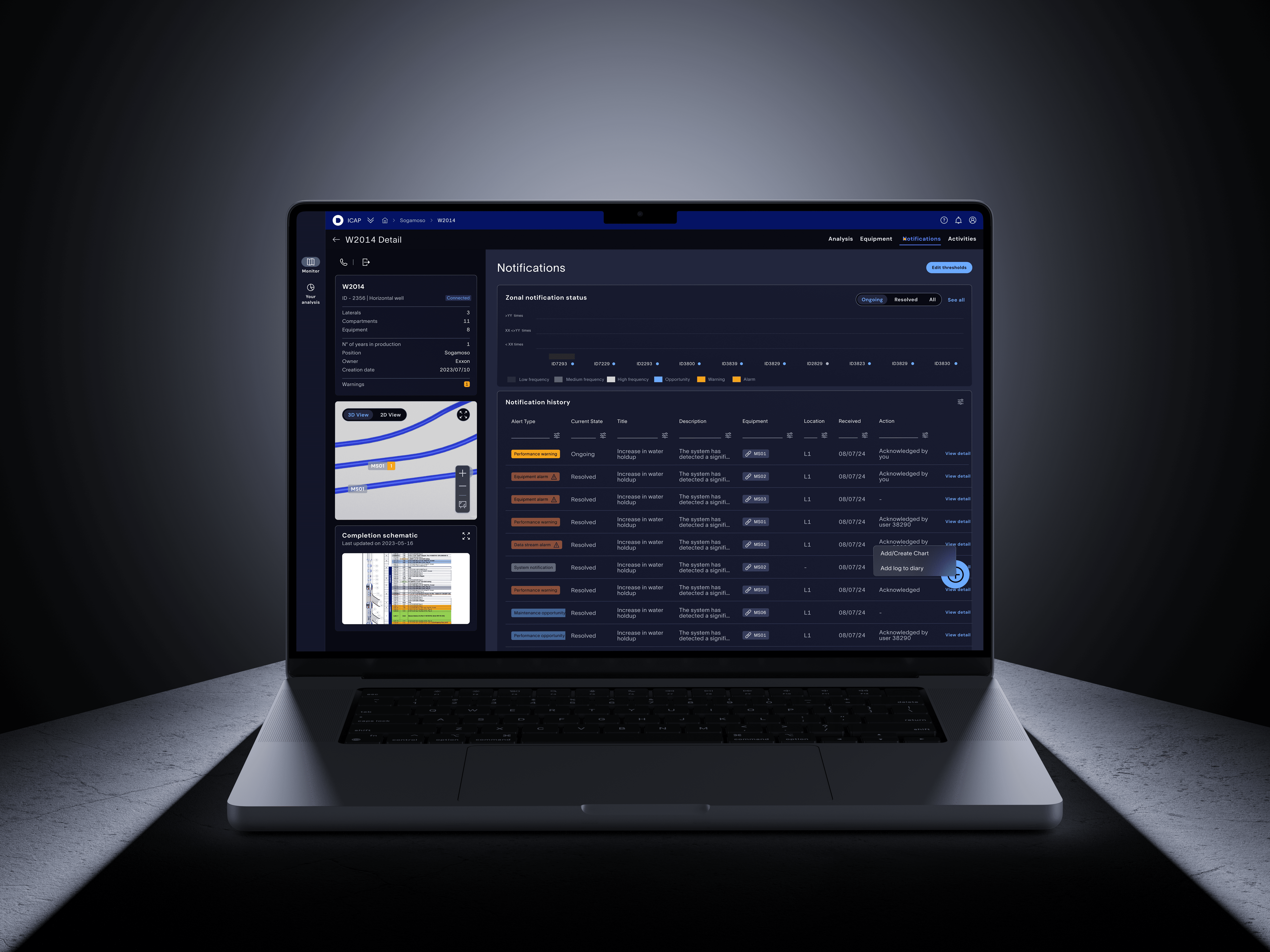 Well Level: As users zoom in, the interface adapts to display data for a specific well, contextualized and actionable.